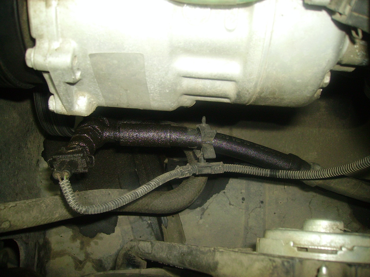 Това е маркуч за хидравликата на волана (серо-управлението). Вероятно проблема не е нито в маркуча, нито в съедининението, а в датчика над тях (в който се включва куплунга). Почисти всичко хубаво с обезмаслител и като запалиш колата, ще се види откъде точно тече. Ако е между маркуча и металната пресовка или между пресовката и тръбата,тогава сменяш маркуча с друг (опитват се да ги правят ама точно тези на Голф 4/А3/Сеатите и на А4/А6 трудно се получават както трябва). Ако тече между металната част на края на маркуча и съединението към хидравличната помпа - разглобява се и се сменят медните шайби (дихтунги) на сглобката. Ако тече от датчика - сменяш датчика.