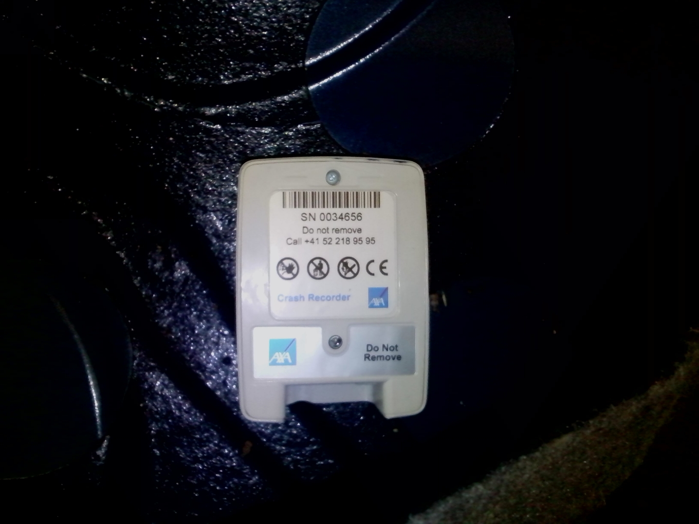 На устройството пише "Crash Recorder", залепено е за ламарината под седалката и не виждам никакви кабели да отиват към него, но в същото време един червен диод на устройството премигва от време на време.