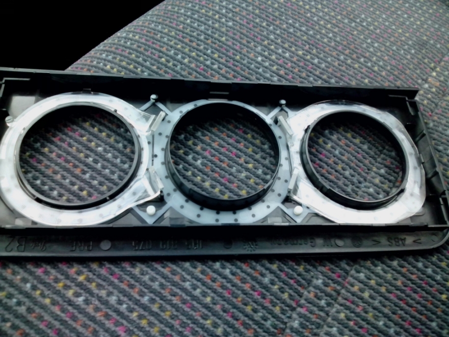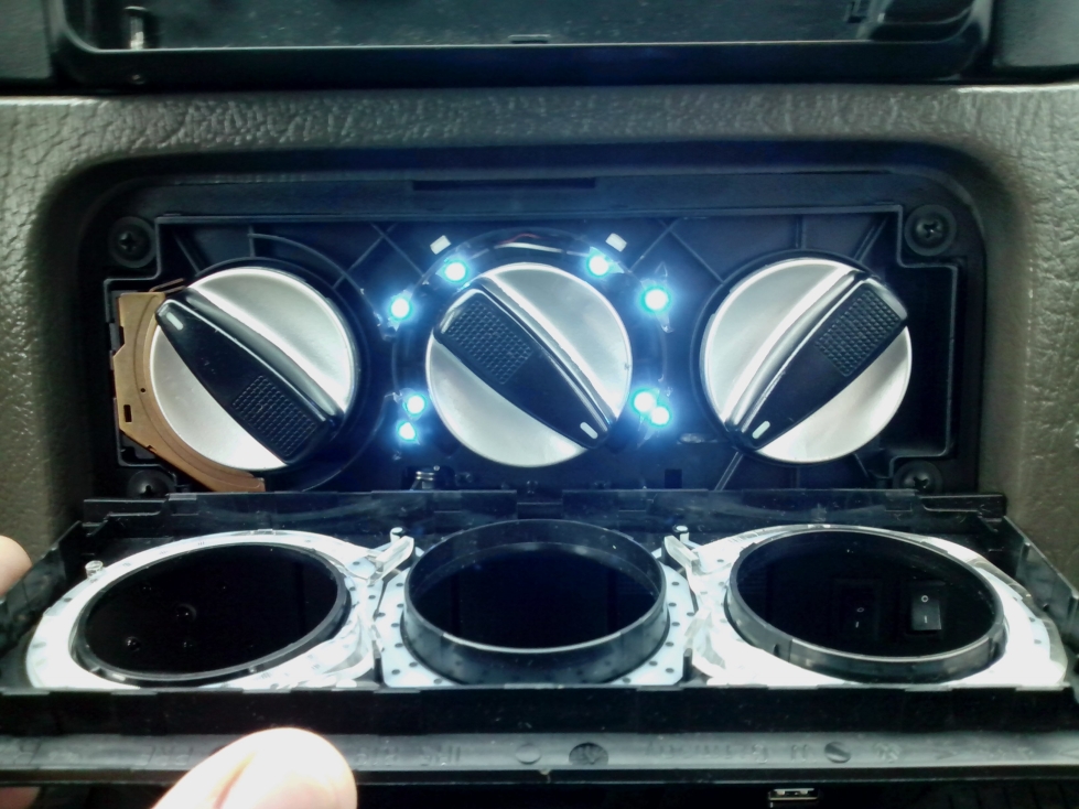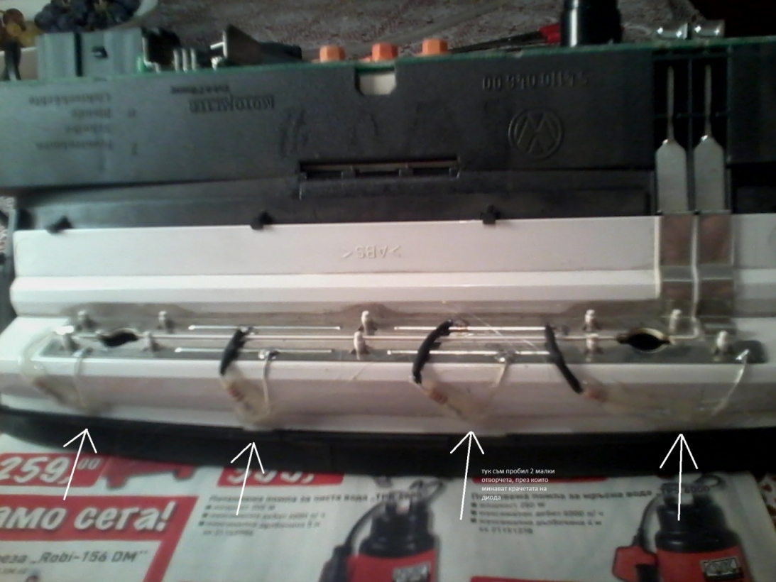 Ето така разположих 4-те диода в инструменталния панел. Освен оригиналното осветление, от вътре изкарах и зелената вложка която бяха сложили.