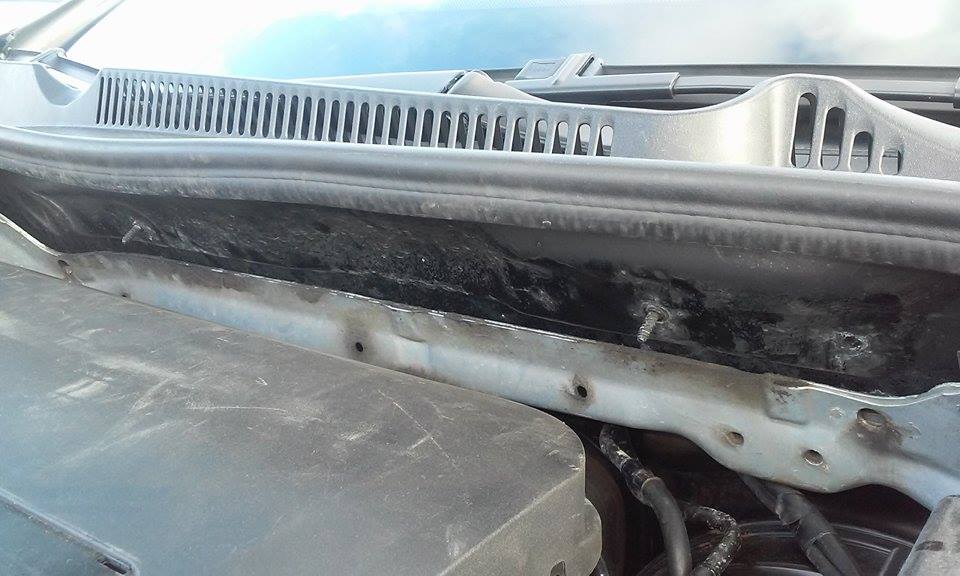 Според мен липсва някаква пластмасова кора, която се захваща с щипки през дупките с пластмасови гайки през двете шпилки и се захваща и с уплътнението (защипва се и с него). Номера на рамата мисля, че е под чистачките при горната пластмаса. Може в КАТ да са гледали да не е рязано нещо там по купето и да са свалили тази кора.