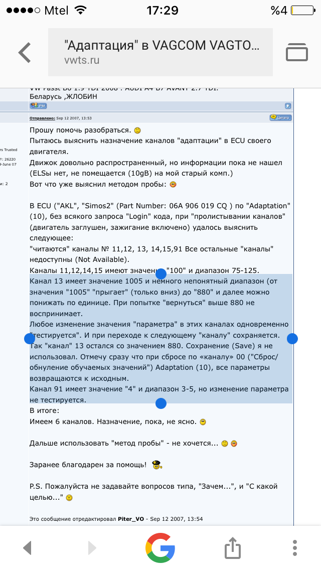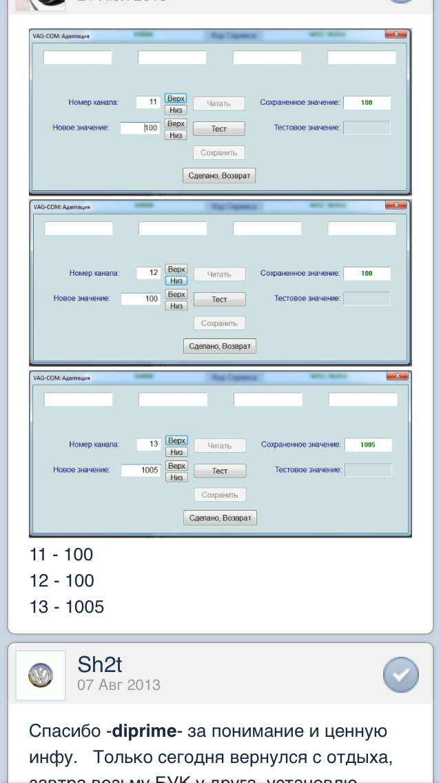 Понеже без да изкам промених стойноста на канал 13 ако някой знае можели да ми каже от vcds програмата на Еngine- Аdaptation- cnannel13 стойностите трябва да са 1005 но не позволява save за да се запамети тази стойност както си беше преди.максимум може 880 или по малко. Колата е голф 4 1.6 акл. Има ли някъв проблем да си седи на 880 и за какво служи този канал с тази стойност. В руски сайтове гледам и други колеги са се сблъскали с този проблем но резултат никакъв .....прилагам и снимки какво точно имам предвид и коментар от руски сайтове относно проблема със син фон на снимките