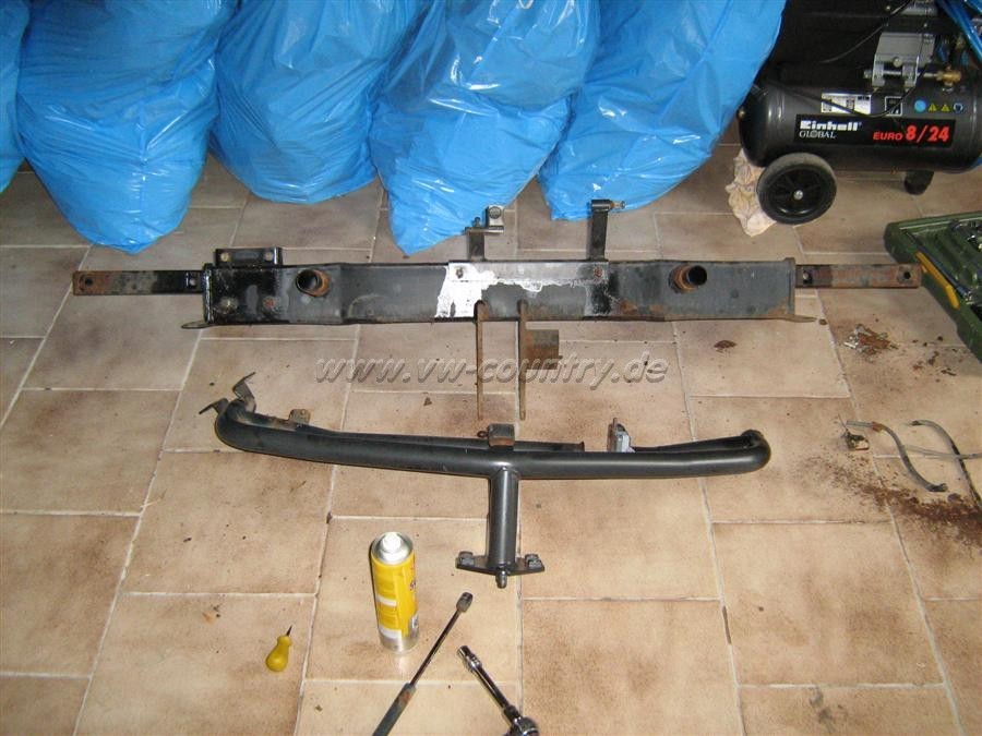 Става, ако няма да монтираш панта с резервна гума. Иначе само металната основа на пластичната облицовка може да се ползва с малко изрязване. Самата греда на задната броня на кънтри-то е доста по-масивна заради стойката на резервната гума и теглича, спрямо задна греда за обикновен Голф2 с теглич. За съжаление не направих снимки на моята, когато правих профилактика, затова ето нещо от нета: