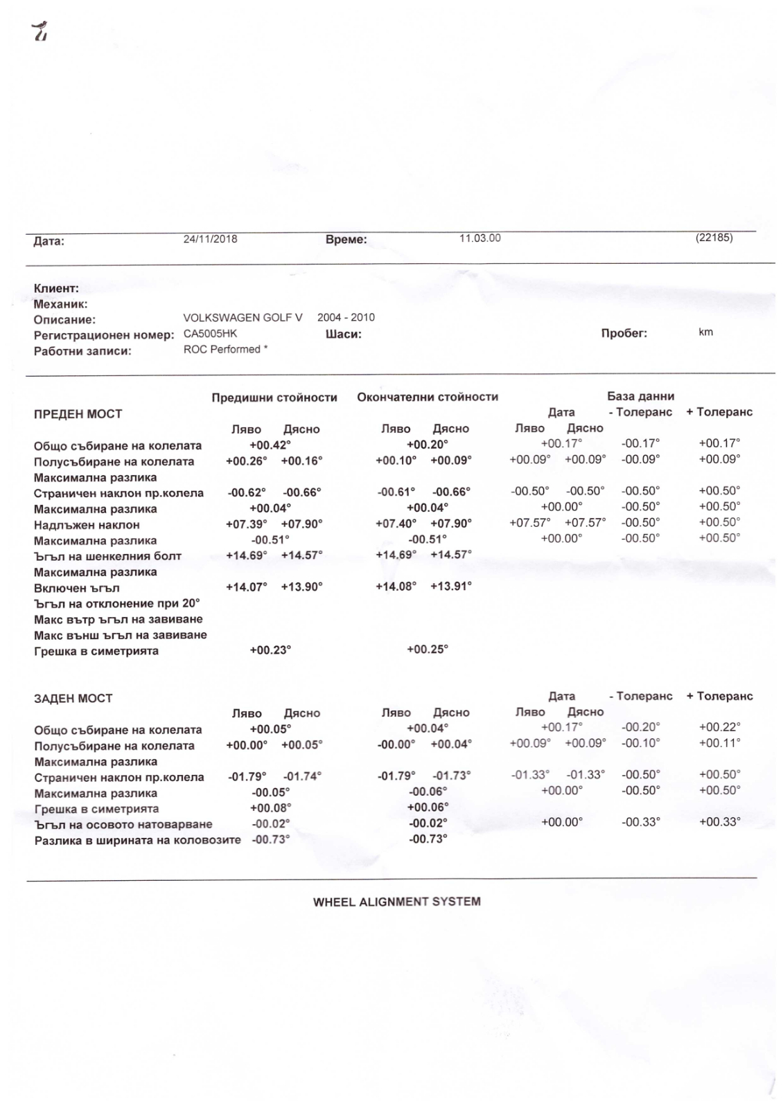 Здравейте колеги, моля който знае кое какво означава да разясни за състоянието на преден и заден мост след направен реглаж. Автомобила е Голф 5, 1.6 FSI 115 к.с., 2007г.