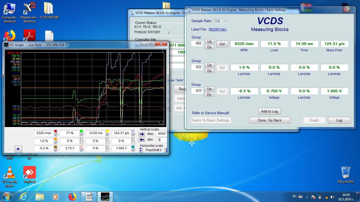 Относно дебитомера - 124g/s е многп добре. А това че прекъсва и не можеш да вдигнеш повече от 5600 ми звучи ксто заминаващ си датчик нс колянов вал. Потърси по темите има много писано за този проблем.