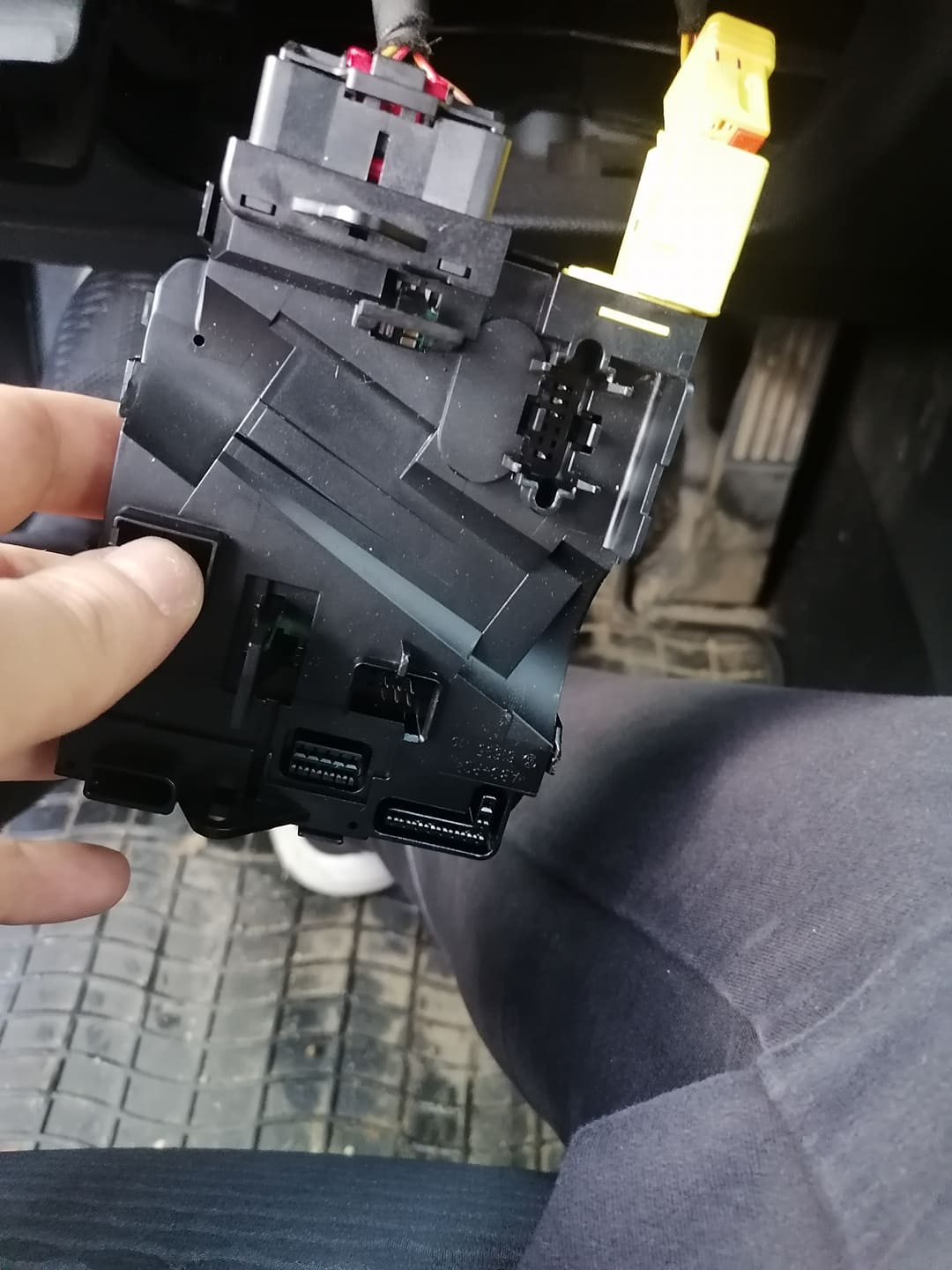 Махате модула, и внимателно махате лентовия кабел (има щипки които се виждат и лесно се откопават с пръсти) , като той не трябва да се превърта (за това залепихме с тиксо предната му част). Ако ще сменяте ръчката - отзад и в процепа между нея и конзолата - към кормилния вал ма щипки. Последната се откопчава като плъзнете нещо тънко в процепа - аз използвах макетно ножче (внимателно с тъпата част за да не я повредите). Издърпвате лоста.