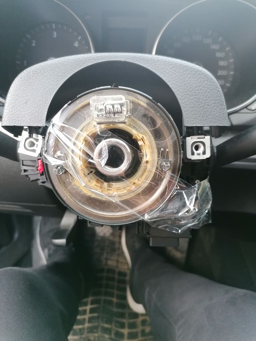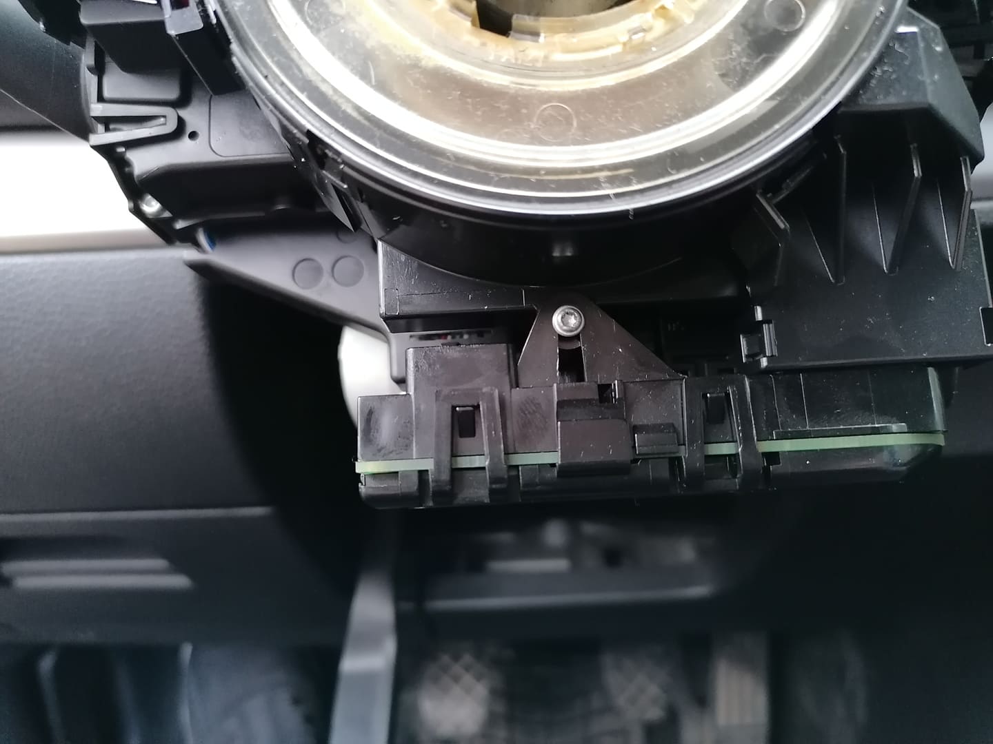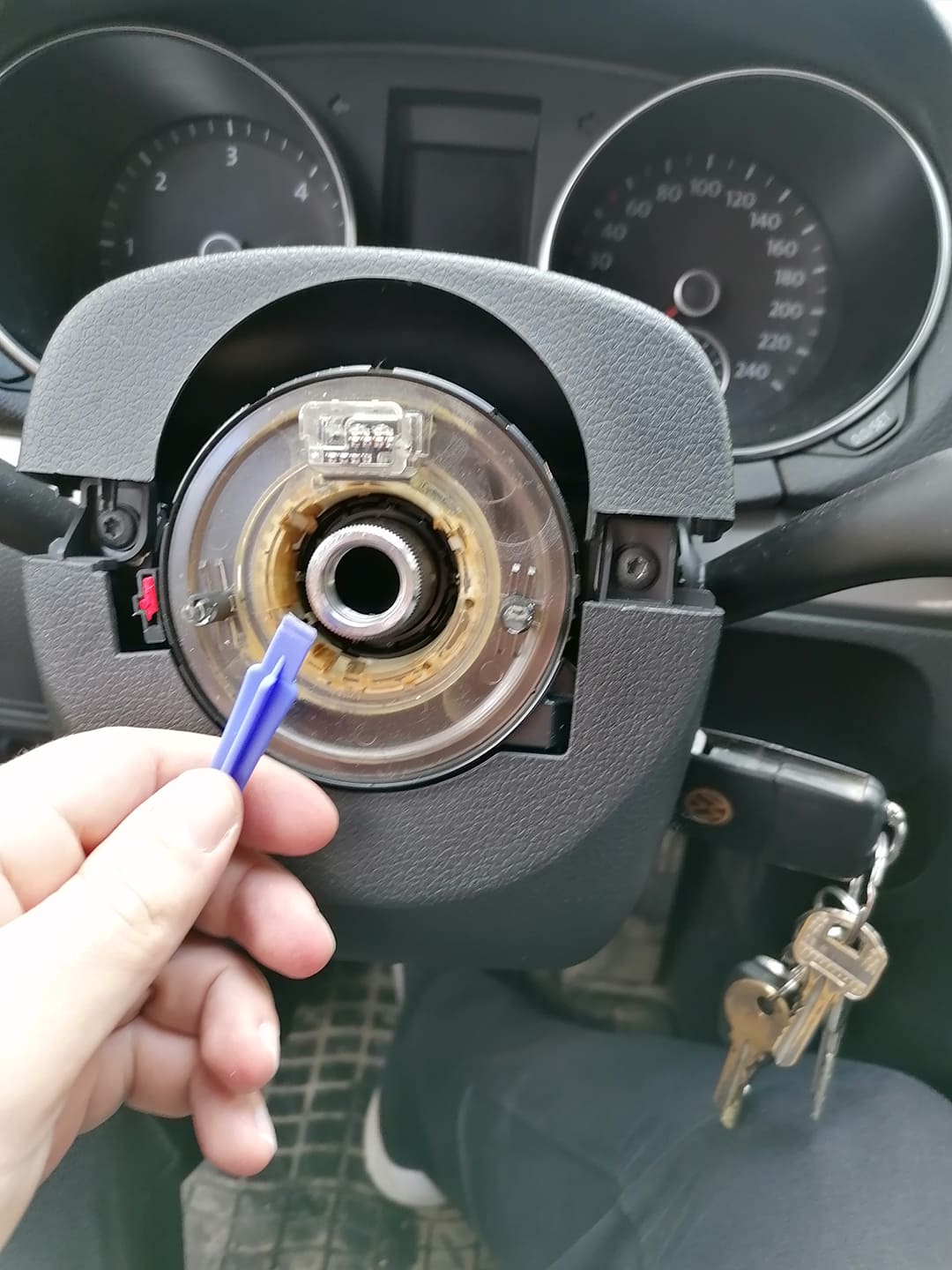 Махате модула, и внимателно махате лентовия кабел (има щипки които се виждат и лесно се откопават с пръсти) , като той не трябва да се превърта (за това залепихме с тиксо предната му част). Ако ще сменяте ръчката - отзад и в процепа между нея и конзолата - към кормилния вал ма щипки. Последната се откопчава като плъзнете нещо тънко в процепа - аз използвах макетно ножче (внимателно с тъпата част за да не я повредите). Издърпвате лоста.