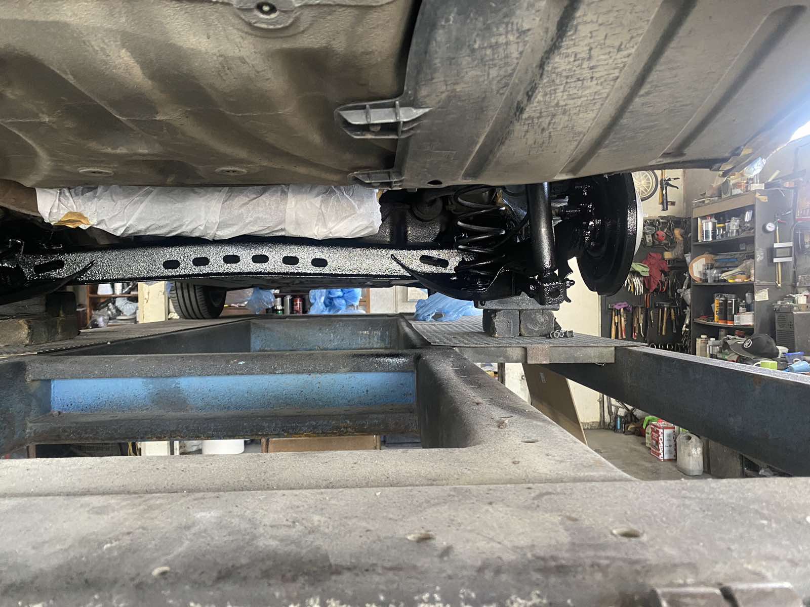 Вдигнахме я на подемника. Отдолу е идеална. Състоянието и отговаря на годинките. Но моста си работи. Ще ми го тръкнат, после вюрт и запечатване с Раптор. Цялата операция 350 лева труд и 64 лева за един литър Раптор.