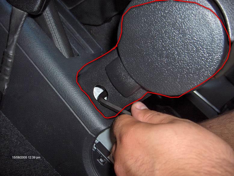 Отдолу е задната поставка за чаши, която има две метални пластинки и с леко натискане на отверката освобождават целия cup holder и излиза плъзгайки се назад.