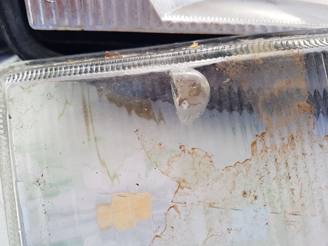 Десен (пасажерски) фар HELLA. Имаше цъкнато от камъче и преди да се усетя и запуша, беше влезнало вода. Рефлектора трябва да отиде до Евертлак (или подобно) за рециклиране. 2 от ушичките на фара са лепени, но до последно се държаха добре. Няма електромоторче за регулиране на нивото