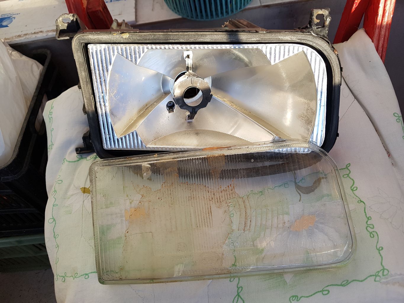 Десен (пасажерски) фар HELLA. Имаше цъкнато от камъче и преди да се усетя и запуша, беше влезнало вода. Рефлектора трябва да отиде до Евертлак (или подобно) за рециклиране. 2 от ушичките на фара са лепени, но до последно се държаха добре. Няма електромоторче за регулиране на нивото