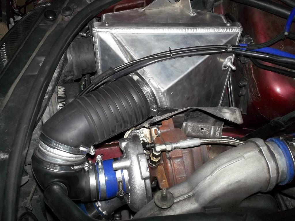 колата вече е в движение,но още не мога да изкажа никакви впечатления,защото турбината е на сток налягане.Даже буст контролера не е закачен,понеже първо искам да отстраним лек теч на масло най-вероятно от изходната магистрала на турбото,нещо не можа да пасне добре фрезованата планка.Наложи се да ползваме маркуч от 1,8 РП за въздушния филтър,че това турбо е с по-широко гърло: