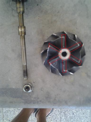 Това е перката от към студената част на турбина карана 60000км със спортен панелен филтър. Единственото износване, което аз виждам е задирането в крайщата, което е в следствие на износване в компресорното тяло и втулките на оста.