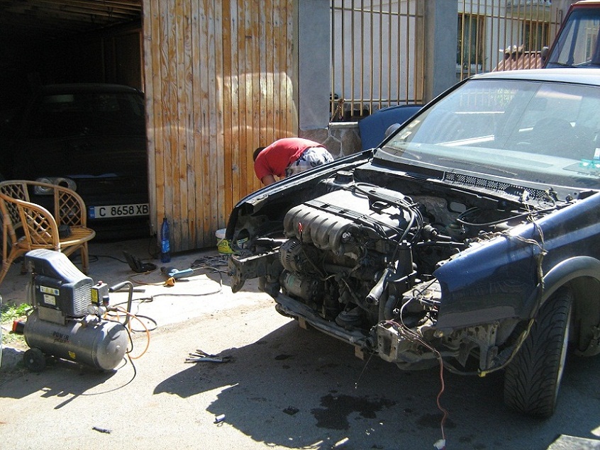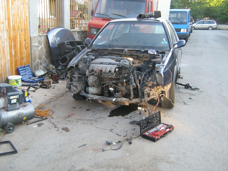 Ето и малко развитие по темата колата вече е със 288мм диск и 5 болта мотора е вън и продължаваме напреде
