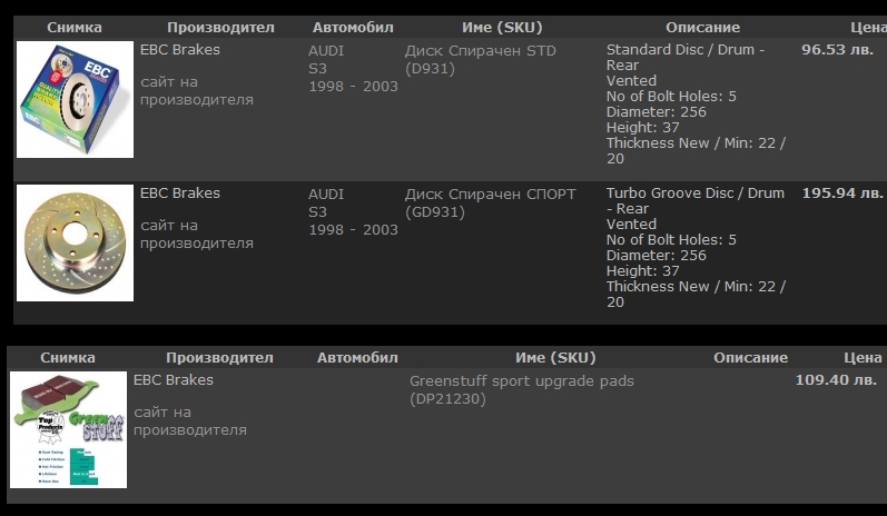 а за отзад искам по голям диск,защото искам винтилирани дискове,а на мойте няма.Та главно сега ме интересува дали има нещо което да ме тревожи ако слагам по-голямите от зад,намерил съм си едни втора ръка от Audi S3 2002 също са на 256 дискове та,главно ме интересува дали ще имам проблем с слагането на апаратите или нещо друго там датчици ала-бала.А за дисковете вече на 100% се спрях на това: и вече в зависимост от това с колко пари разполагам ще е или спорт или обикновенните винтилирани.