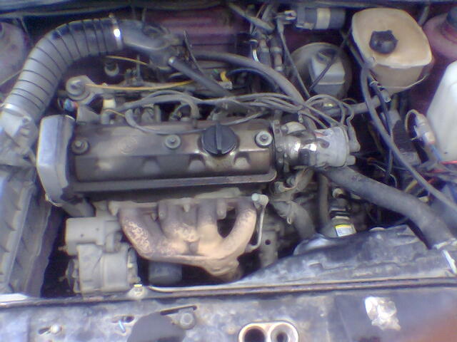След измиването се почна търкането на ръждата , мъка си беше но стана ,последва и последно забърсване за да се обере останалия прах от търкането и почнах да боядисвам. Нямам снимки за тези операции защото бях доста изцапан и нямаше как да снимам , всичко стана както трябва двигателя вече придоби друга визия . Смених с помоща на мои приятел маистор и ангренажния ремък и пластмасовите капаци които го затварят. То преди това се установи,че стария ремък не е бил правилно зацепен и реда на паленето е бил обратен ,но сега вече всичко е както трябва . След като изсъхна боята почнах да зглобявам.Първо монтирах другия съединител обратния(нямам снимка но на всеки е ясно как става) след тва конзолата на масления филтър от голф , изпускателения колектор и едната лапа която е на мотора също от голф.Всмукателния колектор си остава същия защото е еднакъв с тези на голфовите двигатели и така двигатела на аудито е вече подготвен за слагане в голфа .