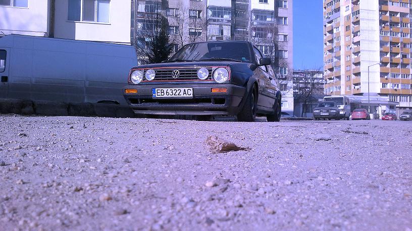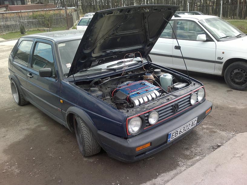 Здравите колеги мисля,че дойде и моят ред да пусна моята тема...или така наречената мечта,която винаги съм искал да осъществя-голф2 вр6!колата е направена януари месец,но пускам сега тема зада има повече снимков матерял а не дасе разводнява темата!за целта беше закупен голф2 КР 91г в що годе добро състояние-машеси забележки но за кола на 20 години мисля,че бяха нормални!като цяло ме интересуваше купето дае здраво....а то се оказа просто уникално здраво...без дори капка ражда!единственото нещо което ме дразнеше още щом го видях бяха синият километраж и най-много хванатите с видий вежди и прагове!за колата ясно....а мотора...и той беше ясен-извесният голф3 вр6 турбо на Тошо_вр6 който е един много мой добур приятел и човек които много уважавам и много мие помагал и с помощ и савети дори и контакти!Ще си зададете вапроса турбо ли щего сложа?не засега щеше дае атмосферен но згастен и с много улекотен маховик!и се започна...денят беше 25 Декември