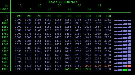 Ей така изглежда бууст карта на 16 битово ЕКУ - единственият фактор е за горивото по Х - 0.01 и резултата е в милиграми: