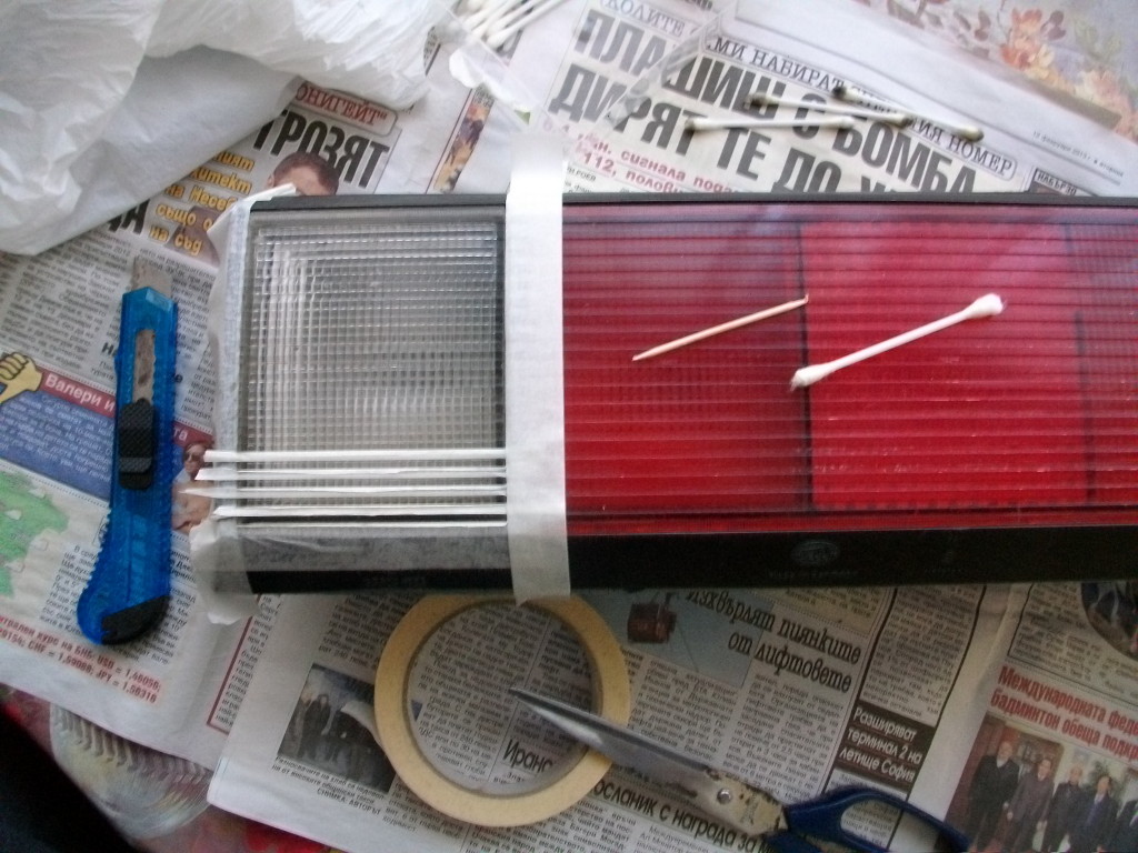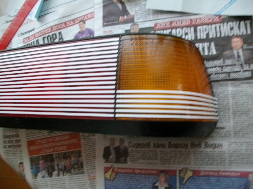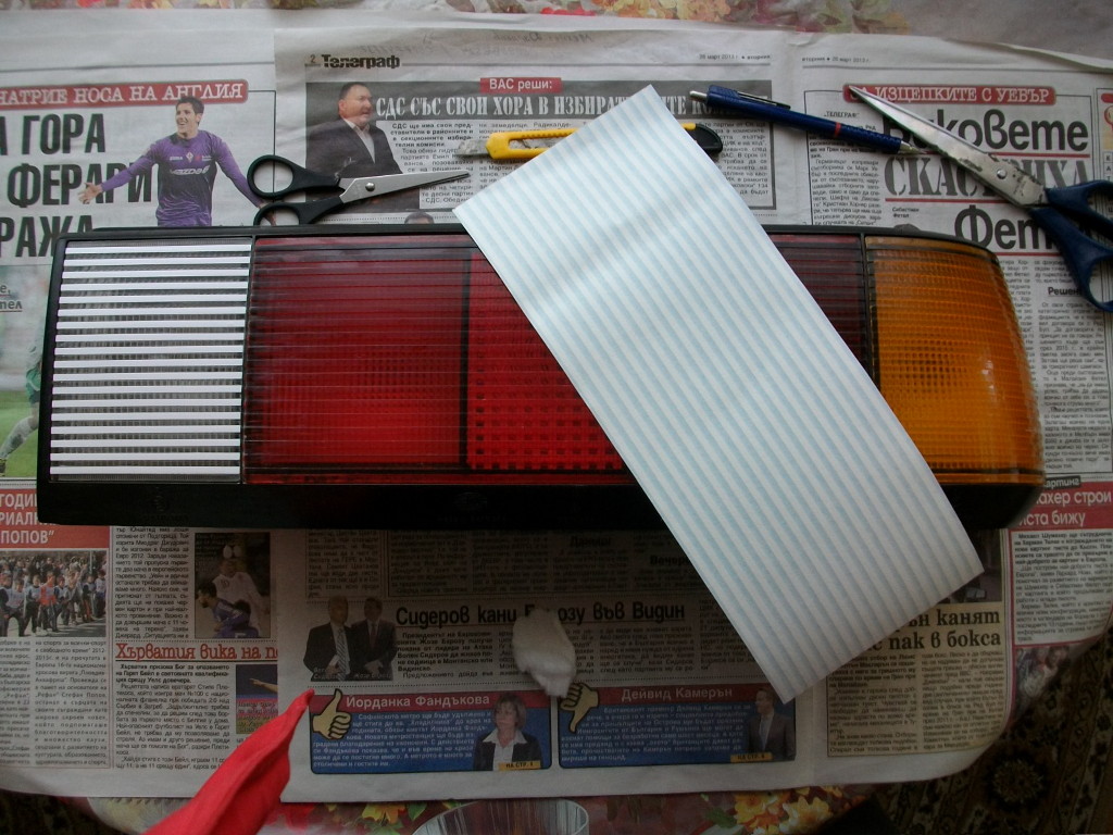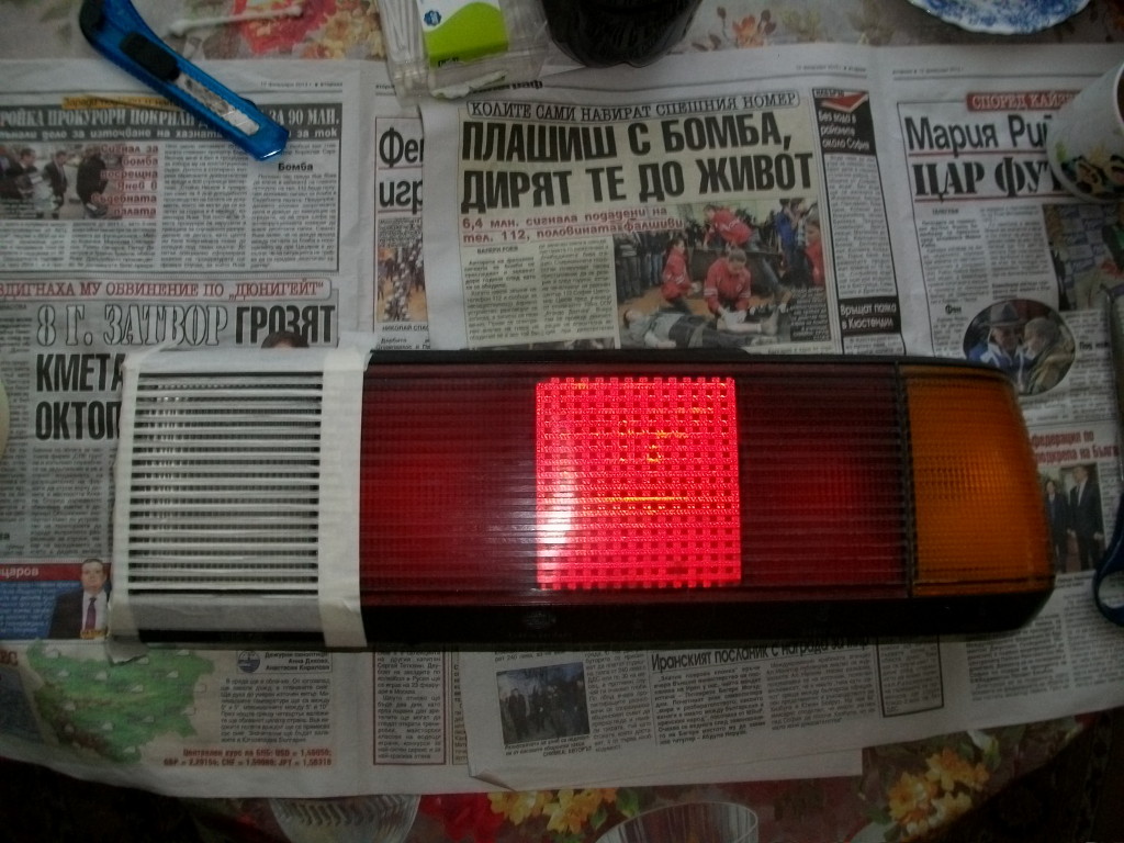 Мина зимата и се започна работа по колата. :smile Тъй като я бях зазимил на топло в гараж около пет месеца, нямаше как да се работи по нея. Същевремено си бях подготвил и набелязал някои неща за възстановяване, които ме дразнеха. Счупения в зоната на мигача заден десен стоп е едно от тези неща. Понеже в мен витае една тиха лудост :mhihi :screwy преди месец реших да оправя този десен стоп, който предварително бях закупил втора ръка. В Scala версията, каквато е моята, както и по старата версия White Cat има тези характерни бели линии върху стоповете, които отличават колата. Лично аз ги намирам за много интересни, придващи индивидуалност и оригиналност на колата. Понеже процедурата с боядисването на надписите мина горе долу добре, реших да я повторя и с белите линиите на стопа. За да видя какъв ще е ефекта от това мое начинание реших да експериментирам с облепване на въпросните линии с доброто старо хартиено тиксо и боядисване със спрей бял гланц. За да не "прецакам" целия стоп избрах за "експеримента" най-малката зона от него, а имено прозрачния участък за светлината за заден ход. :smile След близо двучасова игра облепване и рязане на тънки лентички хартиено тиксо бях готов да пристъпя към боядисване. Предварително бях почистил стопа хубаво да няма мазни отлагания. След облепянето минах с тампон с обезмаслител, защото бях отново замърсил повърхността. След това с навлажнен с вода тампон и накрая подсушаване. След всички тези манипулации започнах да нанасям спрея. Едно, две, три нанасяния през интервали от 30мин. за да изсъхне. Още на първия път разбрах, че няма да се получи... :eek Ефекта беше нулев. Първо боята от спрея не се разнасяше равномерно с което заключих,че белия гланц не е подходящ за тази процедура. По вероятно е да стане с бял мат тъй като той седи по сух и изсъхва в пъти по бързо. Но дори и спрея да беше бял мат поради гланцираността на стопа боята нямаше да държи. Втората причина поради, която не става е, че линиите са прекалено тънки и прекалено много. Хартиеното тиксо не може да залепне плътно и добре на места и разредителите от спрея, лесно влизат под облепените участъци... :banghead и става мазало. Е, както се казва, който не е опитал той не е успял. Рових се дълго в нета по чуждите форуми да видя дали някой е правил подобно нещо, но нищо не намерих. След като омазах стопа трябваше да го почистя от боята без да увредя пластамасата и гланца и. За тези, който не знаят. Никога не чистете с кореселин. Ще разяде сериозно повърхностния слой на стопа и ще матира много. Решението е с лакочистител за нокти. Бавно леко и внимателно се отстранява. Може да се използва и водна шкурка над 1200. Наистина търкането е доста, но по-добре да се запази стопа в противен случай ще го унищожим и естетически няма да изглежда повече добре. По надолу, ще разкажа за решението на проблема с белите ленти! :screwy :mhihi Ето малко снимки от опита с боята. Снимал съм само облепването, защото ме беше срам от ефекта с боядисването... :mrgreen