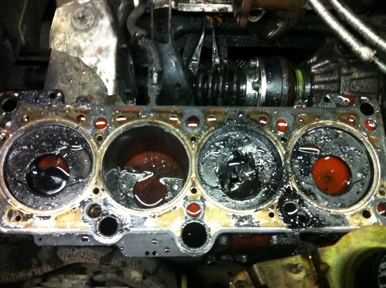 Уви 3 бутала бяха на горна мъртва точка и в 3-то бутало се намираха 2-та клапана.След оглед видях,че всички бутала имат следи от клапаните. Бутала и биели имах АФН-ски ,но за съжаление след като издърпах буталото за преглед на цилиндъра