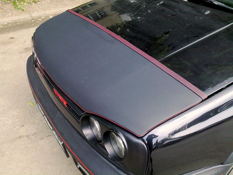 червени шевове,слага се лесно,кожата е супер здрава,от долу е с омекутителна вата за да не наранява капака..с две думи професионална работа...дано ви хареса. седи много яко!