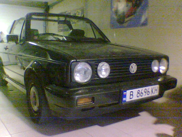 Здравейте, пеших да ви запозная и с моя проект с които съм се захванал. Горд притежател съм на Голф 1 кабриолет и реших малко да го поосвежа. Като за начало замених маската от четири фара на два FK без емблема, и фаровете с кристални. След това се заех със спирачките, замених барабаните със надупчени дискове (с предните се случи същото). След това се заех с окачването, но там се появиха малко проблемчета, пружини от МК3 на МК1 сложна работа, сега съм като расова Немска овчарка :roll: , задницата ми стана малко по-ниска. Скоро ще пусна и снимки.