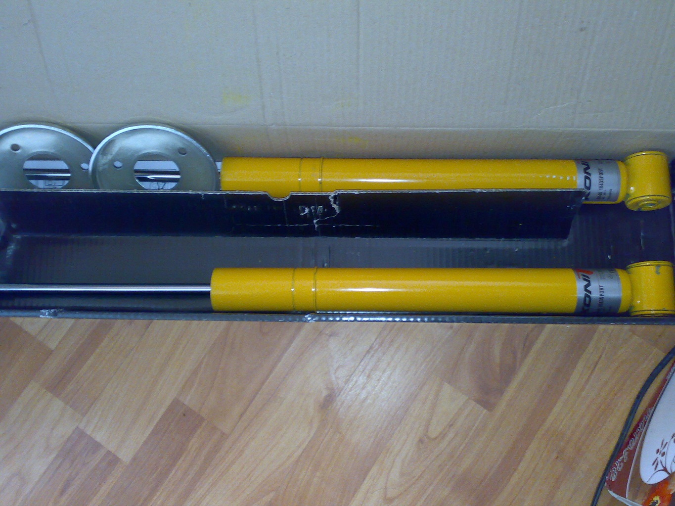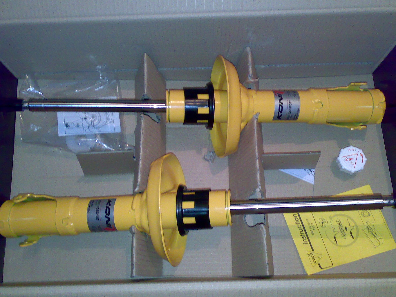 следващата стъпка беше окачването след не много дълго обмисляне се спрях на КОНИ спорт регулируемо на твърдост а задните и на височина, поръчах го и след 45 дена ми пристигна, монтира се и колата стана съвсем различна на пътя