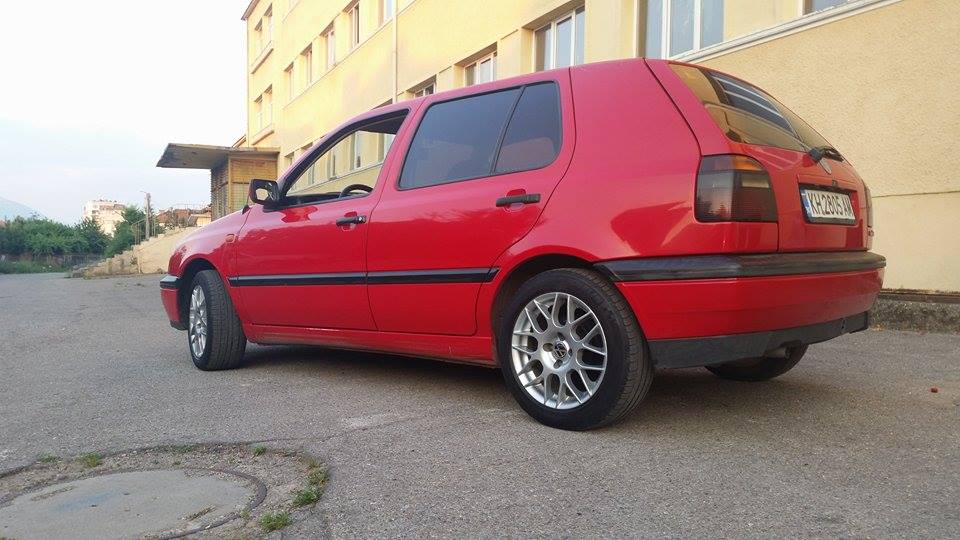 На моя голф съм с 15-ки 7j ЕТ38 с гуми 195/55 и нямам никакъв проблем. Нито отпред опира, нито отзад(при 4-ма човека в колата + бас в багажника). Повечето хора се опитваха да ме убеждават, че с по-големите джанти, голфа ми ще умре напълно тъй като е с АБД- мотора и е на газ... Нищо подобно, вървежа е същия (колкото си е нормално за този мотор), разхода с 14-ки с гуми 175/65 и с 15-ките ми е един и същ - 12 градско и 8 извънградско. Единствената разлика е във волана, понеже нямам хидравлика. Замислям се и аз, дали напролет да не експериментирам със 16-ки.. Ето снимки как изглежда с 15-ките