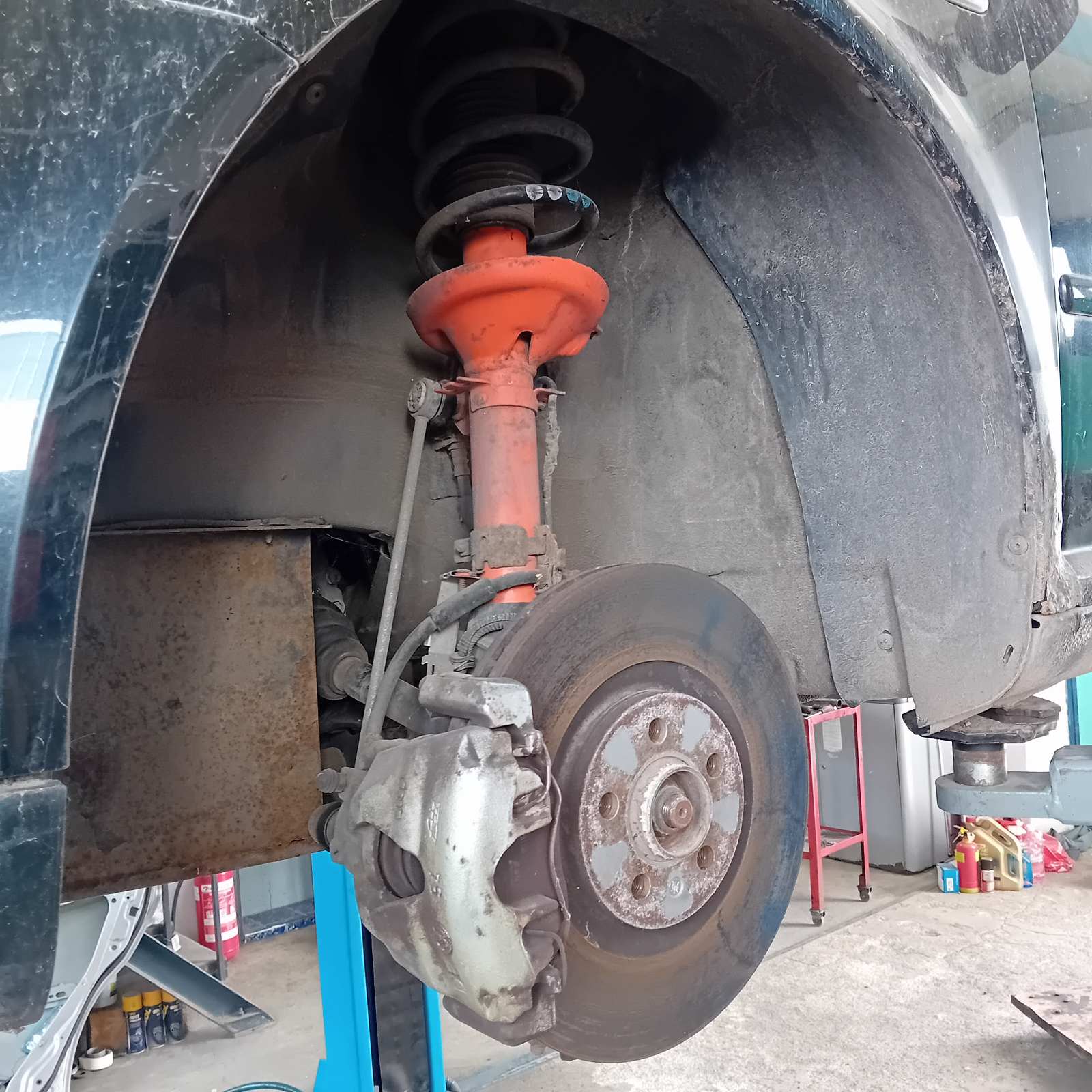 Отзад е с раздвижни щанги за камбер корекция. Отпред е с носачи и шенкели от ТТ.