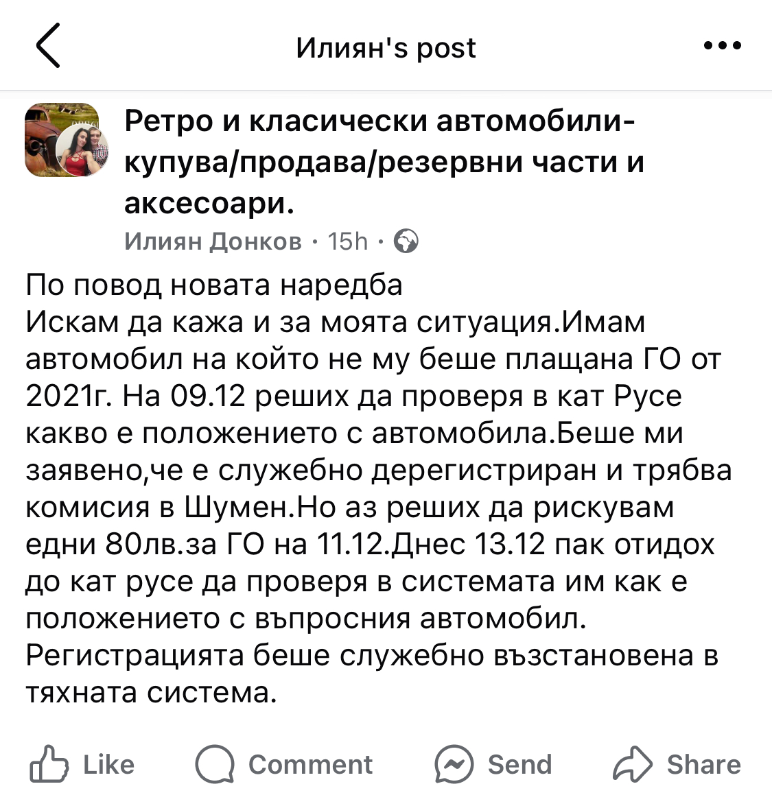 Според мой познат, който е говорил с хора в КАТ, те си имат собствено тълкуване на ситуацията и са приели, че щом не можеш лично да минеш без технотест, то и те няма да възстановяват регистрацията служебно без технотест и няма да изпълняват служебно възстановяване на регистрацията...