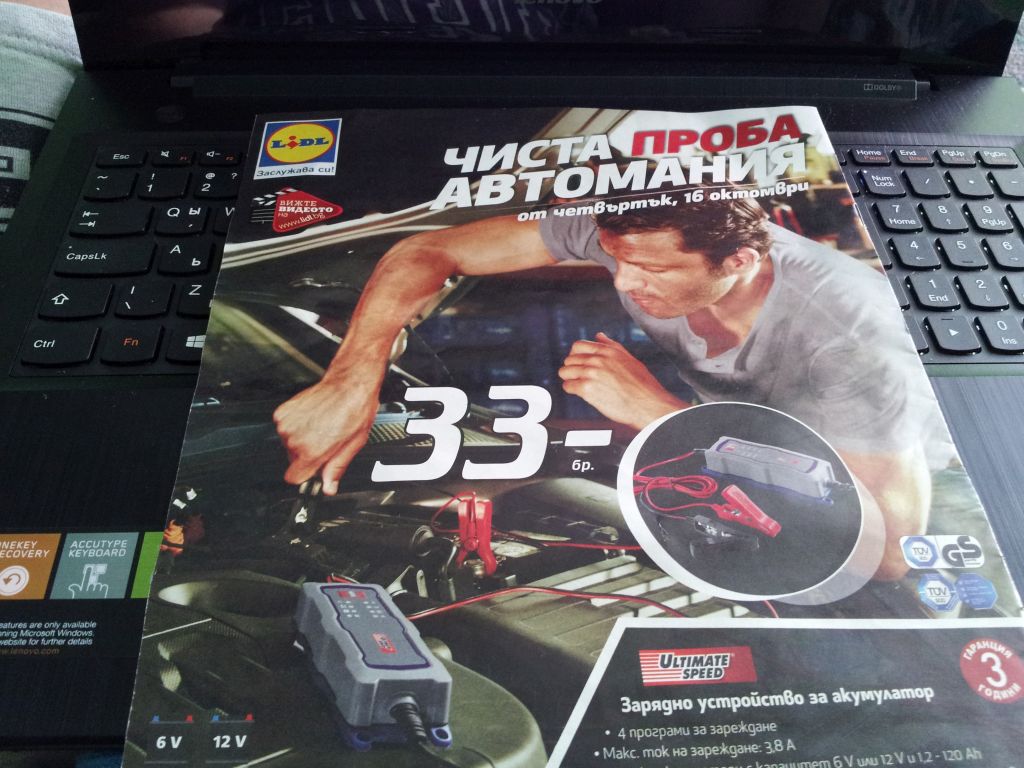 Ето няколко снимки на Lidl-ското,взех от един приятел за тест.И акумолаторът на една колежка,който е хубав но от некаране на колата по месец 2 пада здраво!Предният път не беше карана 2 месеца и беше на 5,9V