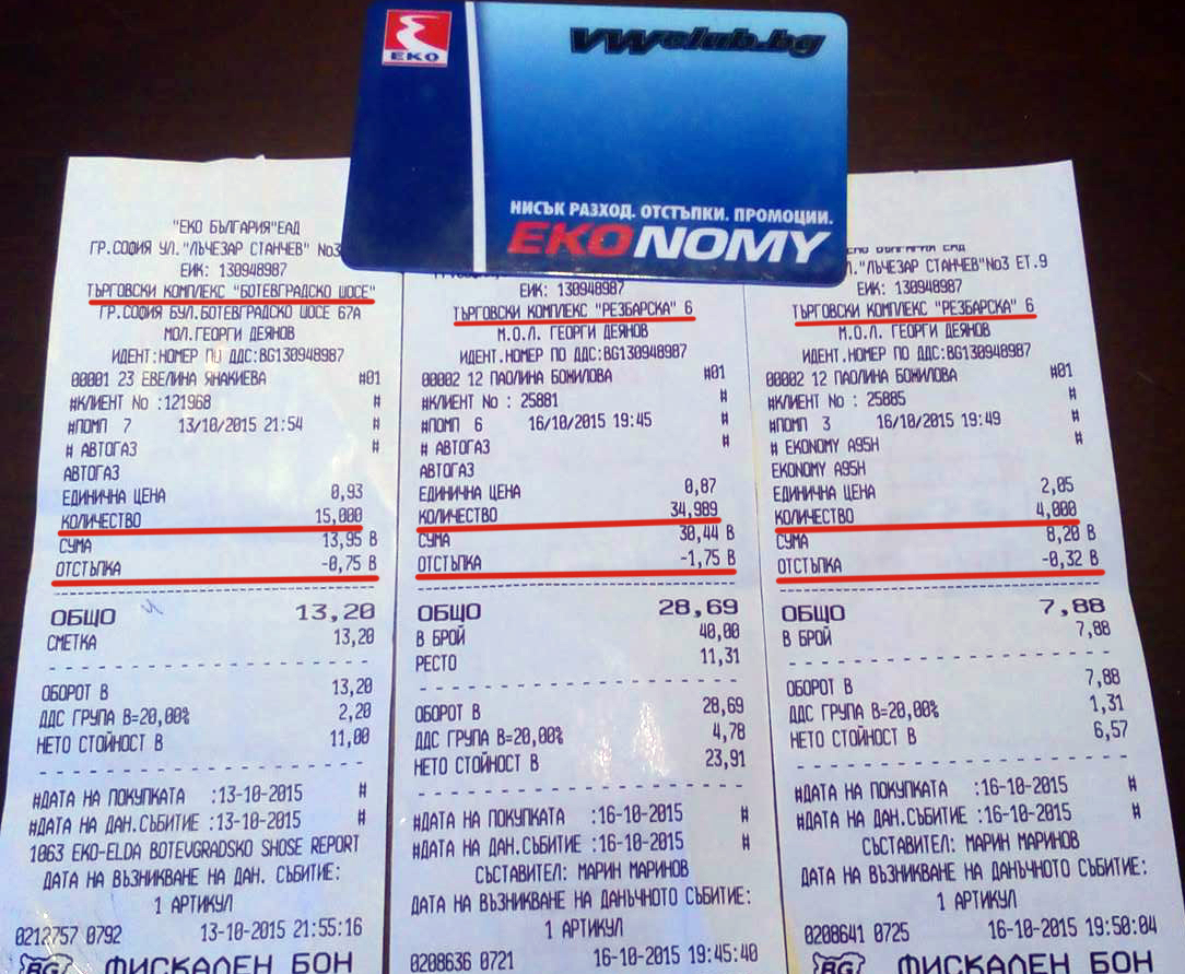 На 16.10.2015 (днес - петък) заредена газ 35 литра, а отстъпката 1.75 лв = 5 ст/литър - ЕКО Резбарска. На Еко Резбарска горивото е по-евтино и реално с отстъпката газта съм я заредил по 0.82 лв./литър..