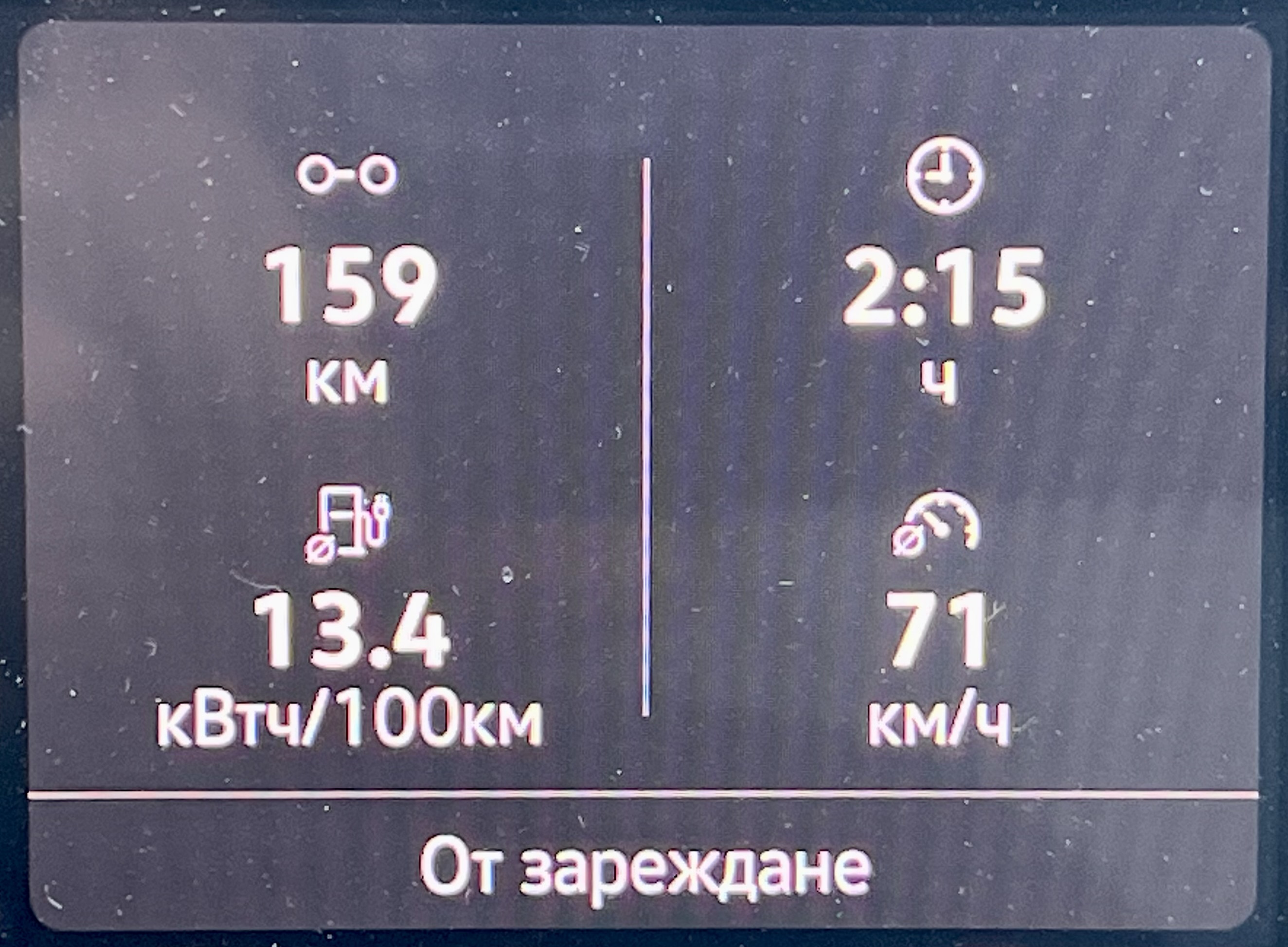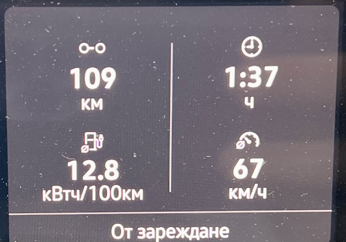 dobrin написа:VW ID4 1-st Pro. 204 к.с., 310 Нм, 77 кВтч батерия. Тръгване на 95 % SoC. Климатик на 22 градуса. Външна температура около 31-32 градуса. Автомобилът е с оригиналната комплектация гуми с джанти - предни 235/50 R20, задни 255/45 R20. Шофьор 100 кг. На отиване с товар около 250 кг, на връщане празен.