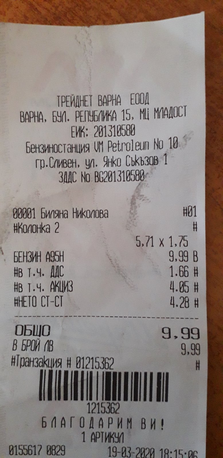 незнам дали забелязвате но в конкретната бележка акциз и ддс е 5,71 а самия бензин е 4,28 лева,т.е. държавата взима повече отколкото струва самия бензин. без пари да петрола цената няма да падне под 1 лев