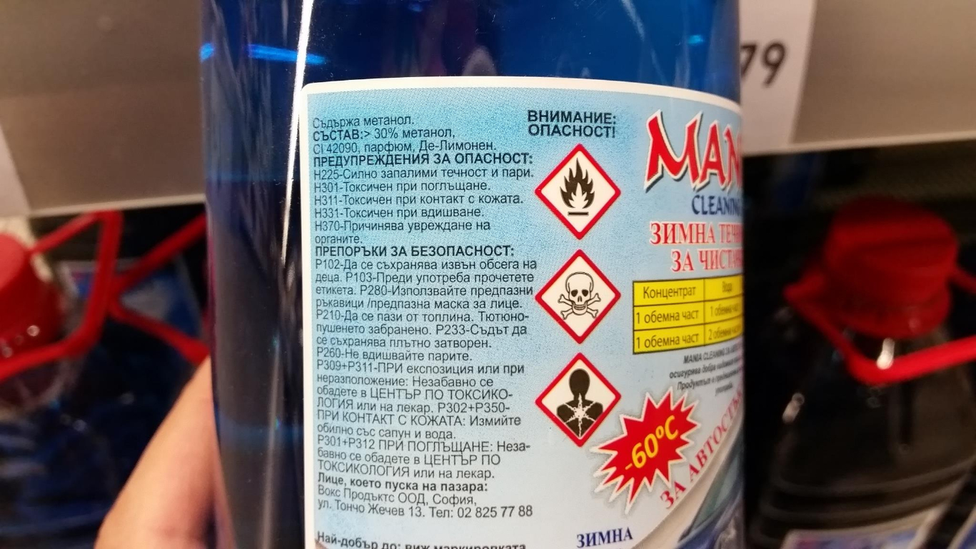 Течност за чистачки с метанол се продава в Billa.