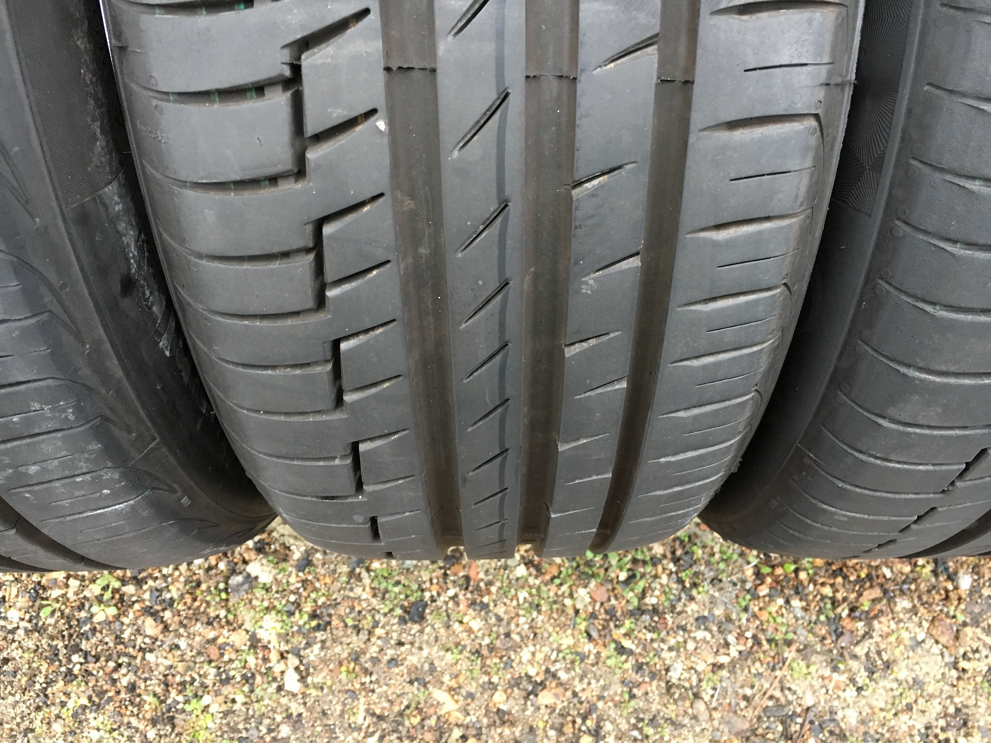 Гумата изглежда потресаващо. И това всичкото се е получило от март месец досега, откак са отпред. Ако бяха останали на задния мост, сигурен съм, че нямаше да са в това състояние както са сега. Случайно ги позагледах тези дни и видях колко са зле, абсолютно неочаквано за мен.