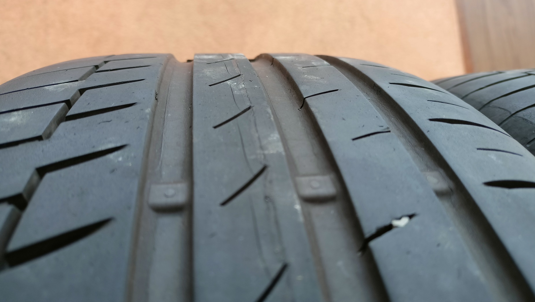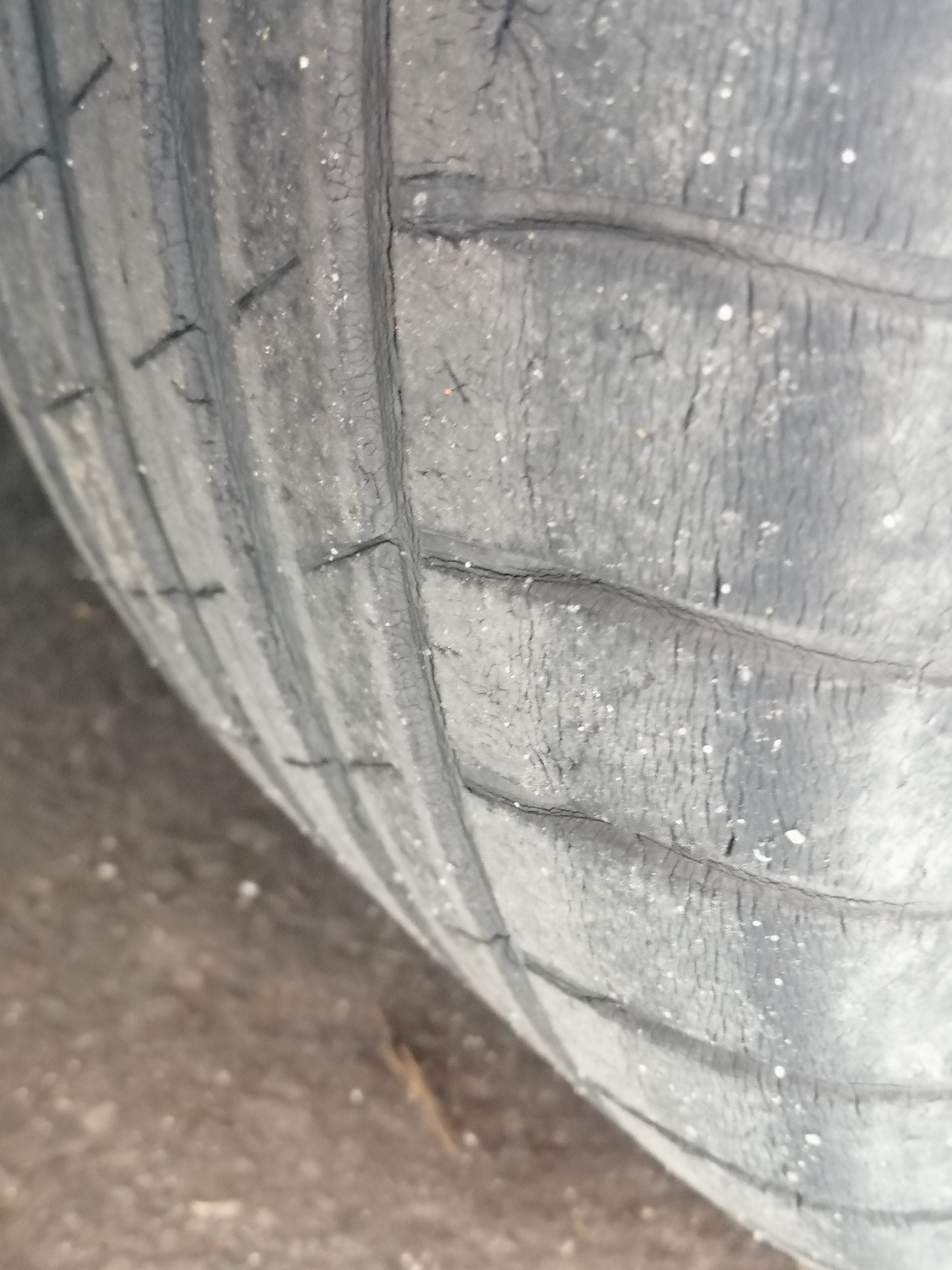 Никакво напукване отстрани на гумата, пукнатини се виждат само в надлъжните канали за отвеждане на водата.