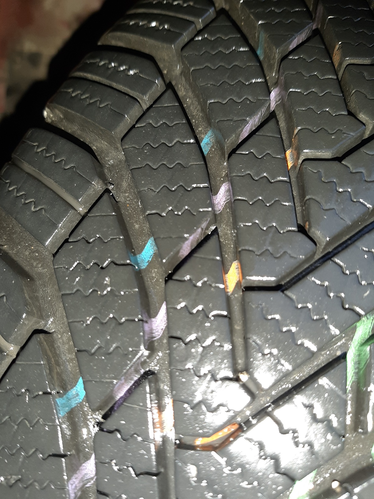 Зимни гуми остарели, опечени имат в 95% едно фино нацепване край бутонките на протектора . Тези го нямат това нещо, това значи, че еластичността на гумата е прилична до добра. Гумите ще карат още.