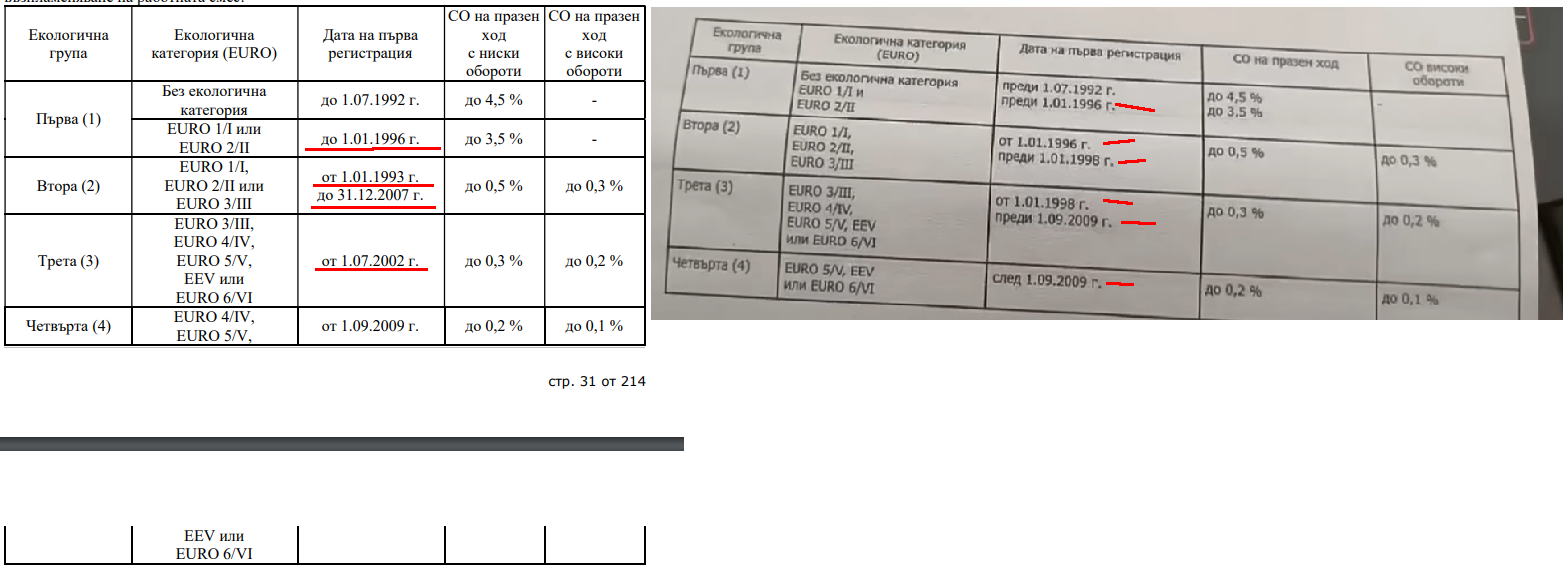 Аз как го разбирам. Новата таблица е по-добре, защото пр. кола ЕВРО-3/ 2005г. може да е ЕКО-3 при 0.3%, или да е ЕКО-2 при 0.5%. Но пък ако даде 0.2% НЯМА да и дадът ЕКО-4. Или ако даде 0.6% пак няма да и дадът ЕКО-1.