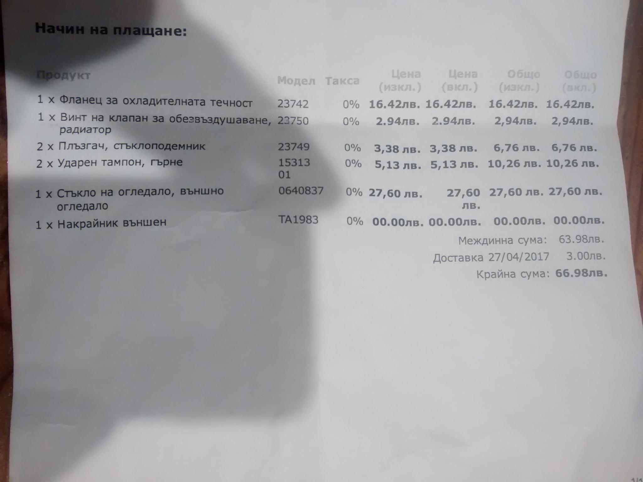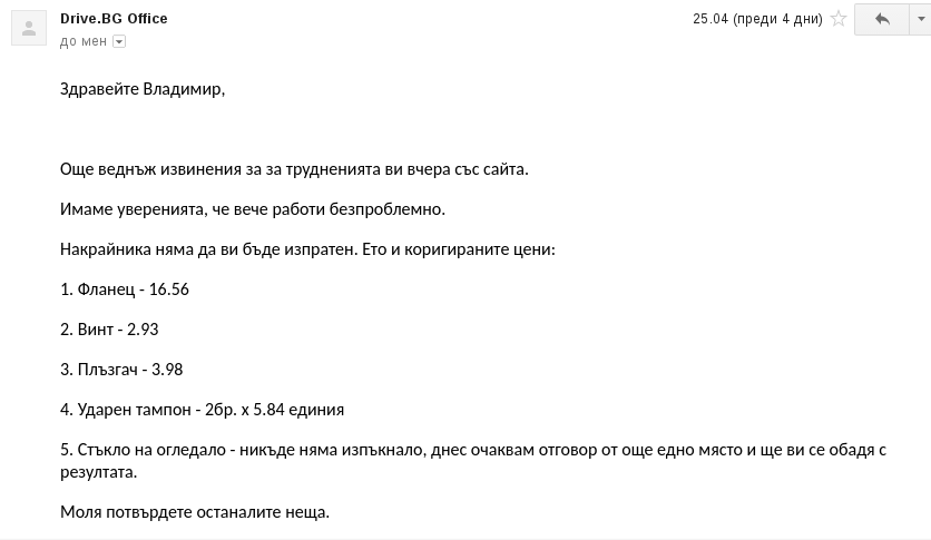 Получих обаждане от фирмата, че не са си актуализирали цените на сайта и те не са действителни. Също така ми съобщиха, че в момента правят промени по сайта си, което е причината за бавната му и некоректна работа. Разбрахме се да ми пратят на мейла новите цени на отделните артикули и че не бързам с частите, така че няма проблем ако се забавят за следващата седмица. Забавянето беше породено, от това, че исках да проверят дали могат да доставят друг модел огледало, което го нямаха обявено на сайта си.