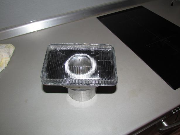 След като монтирах тръбата която трябва да събере лупата към фара и капака на тръбата трябваше да се помисли как да се центрира лупата в тръбата. За да не виси само на задният капак сложих 3 ивици от същото лепило (течният метал) в тръбата под 120 градуса (горе-долу) и ги изпилих така, че лупата да влиза максимално плътно. Пръснах набързо рефлектора (или по-скоро останалото от него) със черен спрей за да стои по-добре от вън. Вижда се и фара събран без крушка (съхне санитарният силикон с който залеих стъклата) и се проветрят през дупката за крушката. Вижда се как стои и гуменият капак за фара. Само му трябва дупка за да минават през него кабелите. Също ще залепя по едно пакетче силика гел отзад за гумения капак за да може да попива влагата която се надявам да не се събира във фара (почти херметически е затворен).