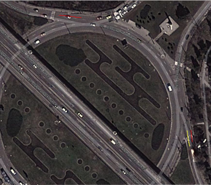 Спускайки се от Цариградско се престроявам в дясна лента(с червено на снимката) тъй като ще излизам от втория изход(все едно пак ще се качвам на Цариградско). Чакам с ляв мигач и в момента в който се включа веднага пускам десния. Обаче... вече на няколко пъти се случва следното. Спират разни коли в лявата лента(с жълто на снимката) с намерение да излязат от първия изход(бул. Асен Йорданов на снимката). Става така, че тръгвам аз, тръгват и тези в лява лента за първи изход и естествено клаксоните по мой адрес не закъсняват.