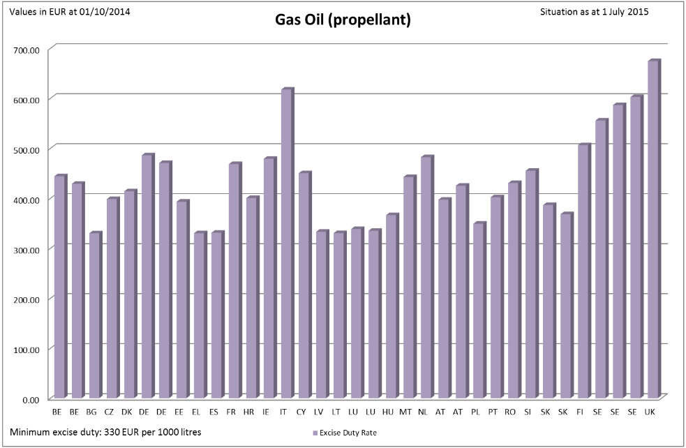Акцизът на дизела в България е най-ниският в ЕС. Той е 645 лева на 1000 литра или 64.5 стотинки на литър, при минимално определен от европейската комисия 330 ЕВРО на 1000 литра или 64.6 стотинки на литър за дизела. Т.е. сме дори с части от стотинката под минимума.