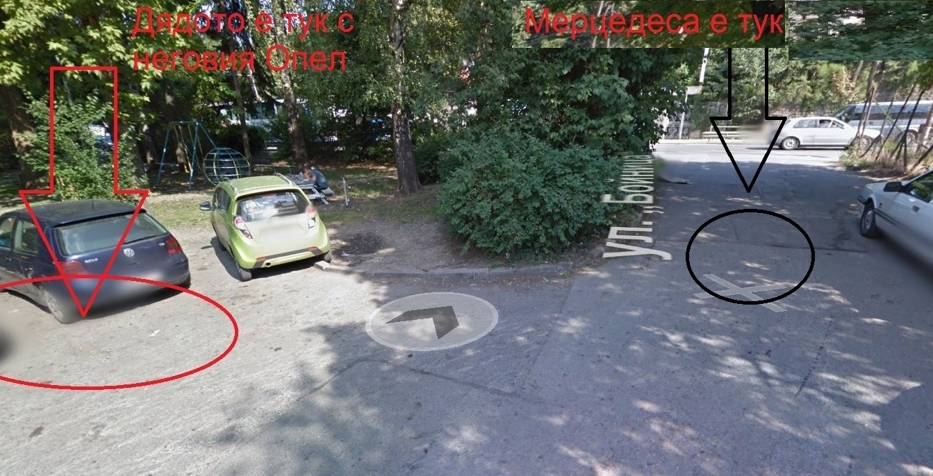И тук се развива действието, в квартал Княжево има един извор, от който хората си пълнят вода за вкъщи. Паркирам аз и един дядка на възраст 65-70, но си караше колата добре. С него си напълнихме тубите, но аз свърших по-бързо и тъй като беше слънце и -5 градуса реших да слезна с колата на 20 метра по-надолу и да не преча на хората, защото исках колата да загрее малко и съответно седнах в нея и чаках (на Картинка номер 2 съм го отбелязал).