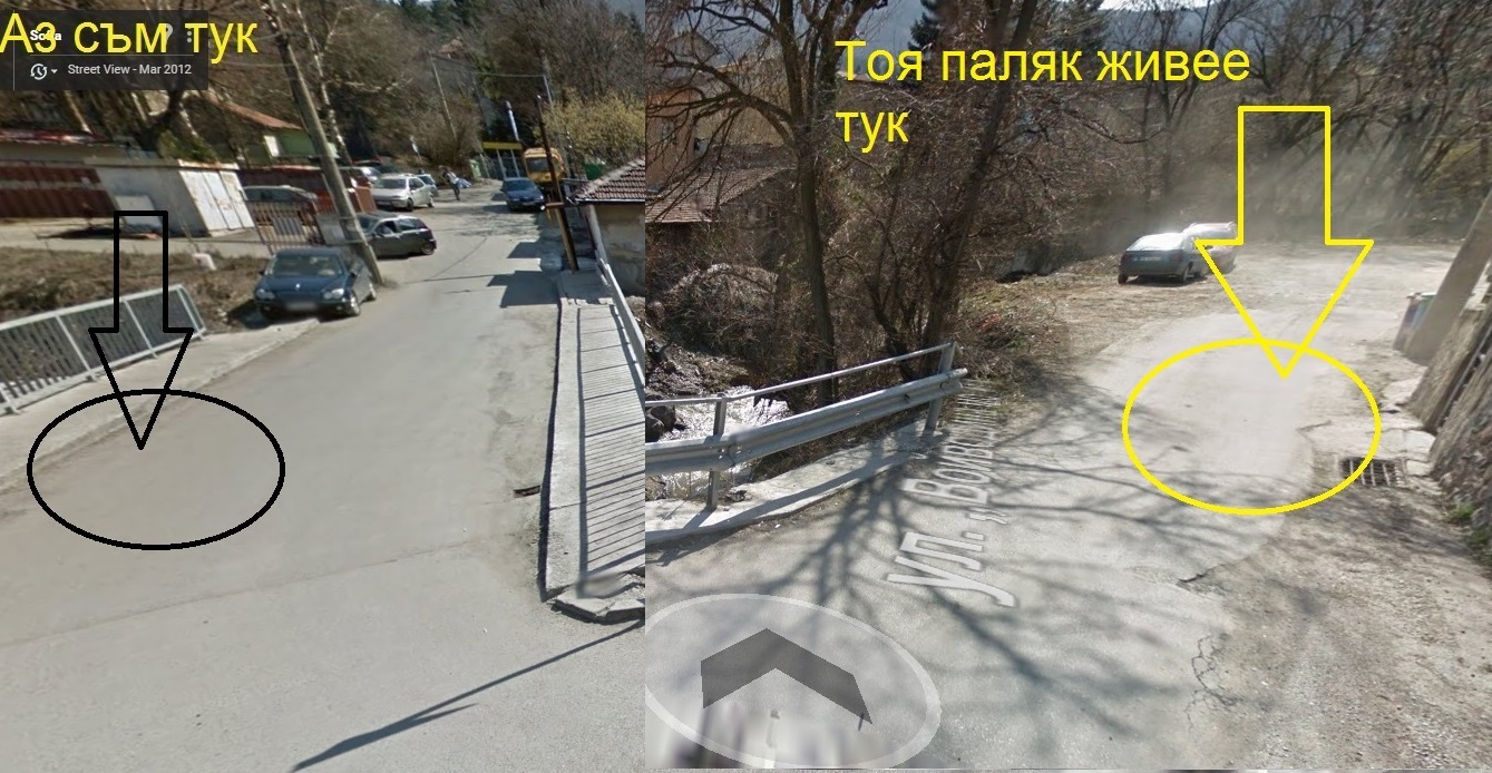 В този момент, виждайки тази НЕСПРАВЕДЛИВОСТ се паля и ставам от колата, отидох до дядото, видях счупеното стъкло и се нервирах. Признавам, че дядото нямаше шанс и за 1 секунда дори отстъпи, но аз му казах че това при мен не МИНАВА, и също имаше жена с дете, която беше пряк очевидец и беше възмутена. Казах му че това няма да остава така и тръгнахме надолу до къщата на това к*пел***е, веднага се скри, побягна като женичка (мишка) и се скри вътре в двора може би. Жена му тъкмо беше паркирала и беше на входната врата, заговорихме я, казахме й веднага истината какво се случи и тя го видя, но веднага реши да се застъпи и НАГЛО отрече. Не постигнахме нищо с разговора си с нея, дядото й каза че това е неприемливо, жената с детето й каза че това не отговаря на НОРМАЛНО и адекватно поведение на мъж на 40-45 години, аз също казах на жена му че това не е мъж, и да излезне и да се разберем. Очевидно беше безсмислено, след последното изречение на дядото към жена му, аз с удоволствие му теглих една пред нея. Тръгнахме си, дядото ме изпрати на 5 метра до моята кола, културно ми благодари и продължи нагоре към неговата кола. Запалих и в този момент се обърнах към къщата, тоя смешник беше застанал до вратата на двора му, не посмя да излезе, може би носеше някакво оръжие, не знам пистолет/нож/друг предмет. Запалих и тръгнах.