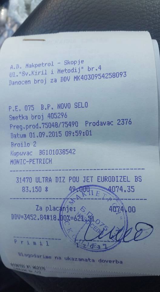 83.150 литра за 4074.35 динара, т.е. 1.57 лв. за литър