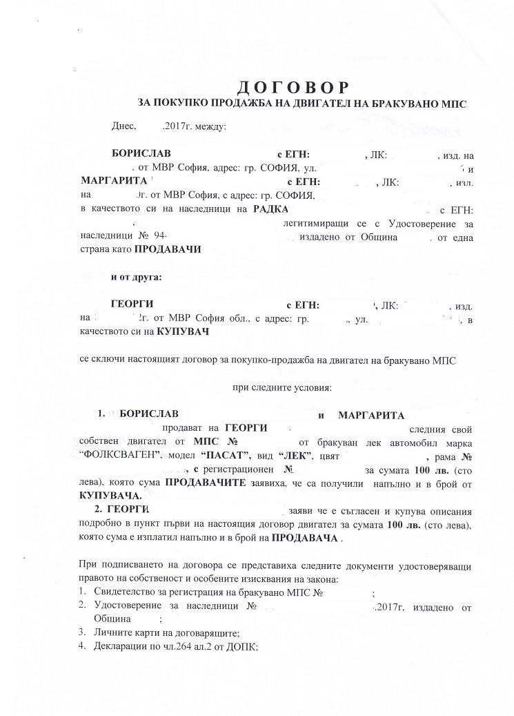 Първо трябва да бракуваш колата с двата талона и регистрационните номера в КАТ. Само металната част от табелите, иначе трябва да ги разделяш на самото гише, което не е много удобно. Като те питат къде е колата, ще кажеш, че е на частен терен. Талоните ще ги надраскат с маркер, ще ги надупчат и ще ти ги върнат. Двигателят се продава с договор свободен текст, придружен с ксерокопие на перфорирания талон. Купувачът регистрира двигателя с този договор.