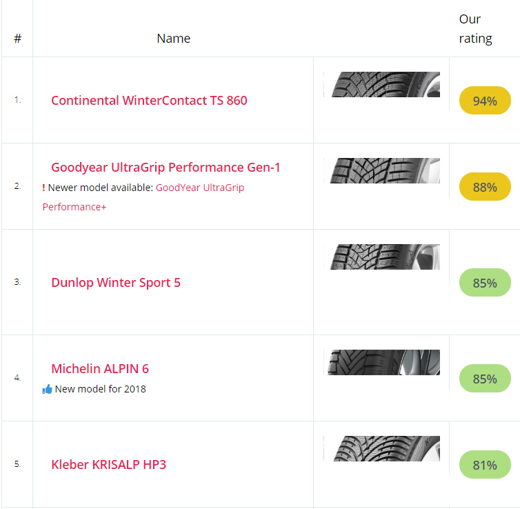 Като цяло съм се спрял на Michelin Alpin 6, но взех да глоня и към Goodyear UltraGrip Performance+ днес (в дадено ревю са на 1-во място), а това с шума което прочетох нещо ме възпира, а в друго ревю Continental WInterContact TS 860 са на 1-во място.