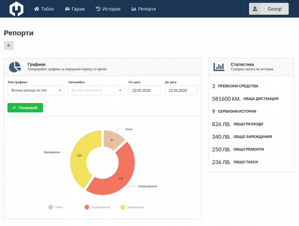 Основните функционалности са добавяне на автомобили, зареждания, ремонти и такси. Можете също да добавяте напомняне за ремонт или такса, за което приложението ще ви уведоми по емейл. Разбира се, има и опция за генериране на статистики за разход на гориво, цени на горивата и др.