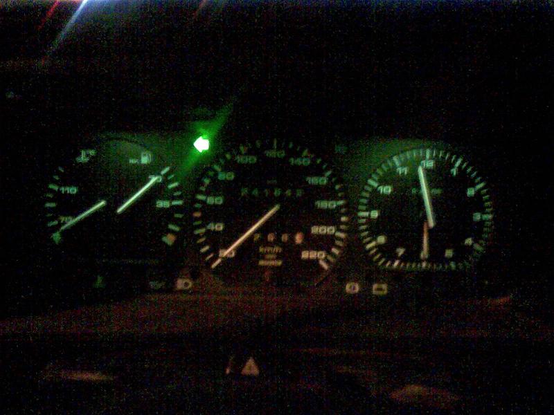 Осветлението на километража го реших по следния начин: лентичка с диоди (лентичката е гумирана с малки диодчета "вградени" в гумировката) на 12 волта, 30см дълга (по-дълга идва от мястото където е предназначено за крушките)... реже се лентата по желания размер (бачка си и след това съвсем спокойно), като е добре да се внимава къде се реже, за да останат светещи всички диоди. Залепва се въпросната лентичка от горната страна на мястото където са били крушките (диодите "висят с главата надолу") и жичката беше запоена към пиновете на таблото където се вкючва захранващата лента на старите крушки!