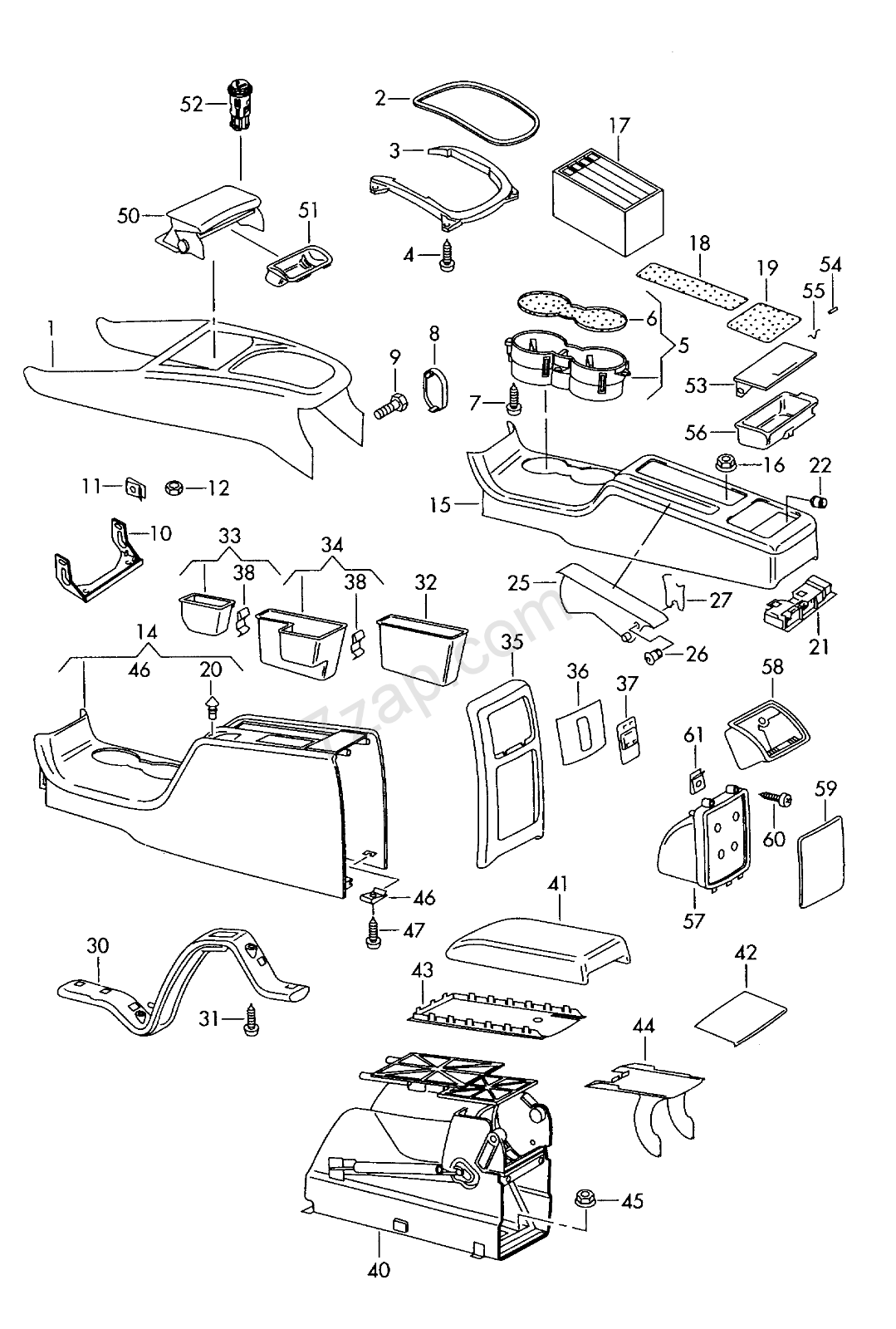Има ги всички винтчета и гайки, дето трябва да се развият, за да се демонтира средната конзола. За задната страна с пепелника има 2 винтчета (номер 60 от схемата), след това тя поада, изпрбвано днес.